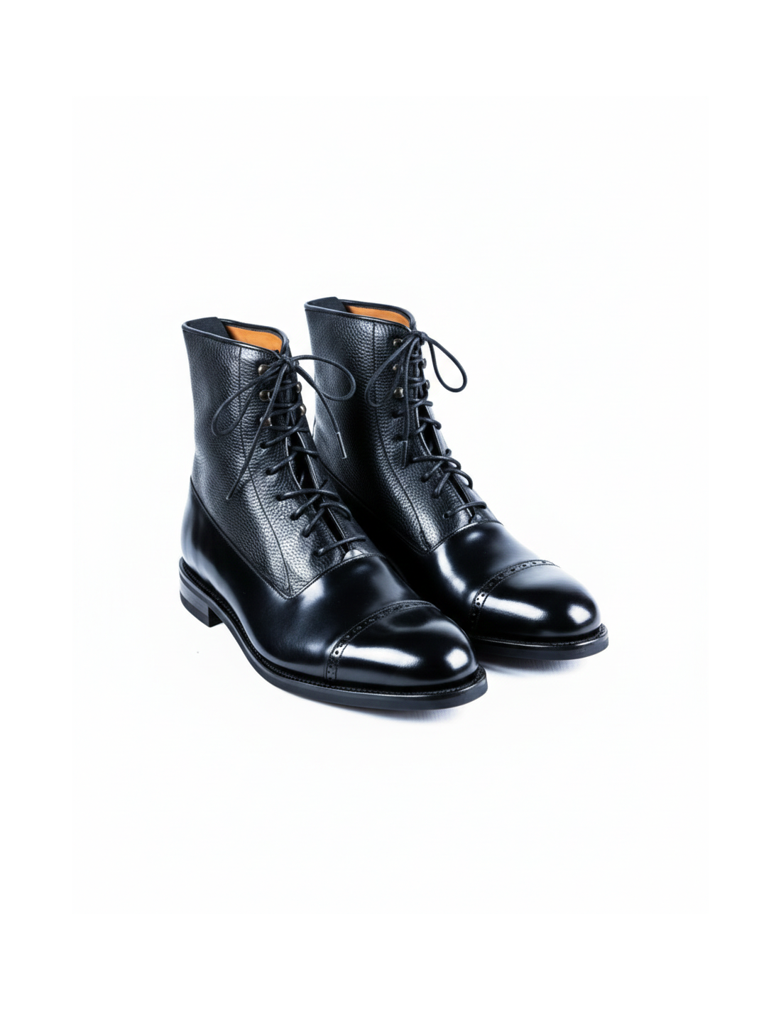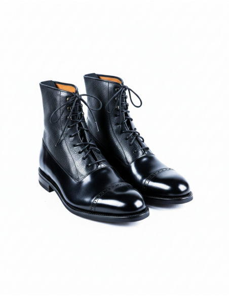 Ankle boots in black antic picusa leather with black vegetal grain leather.