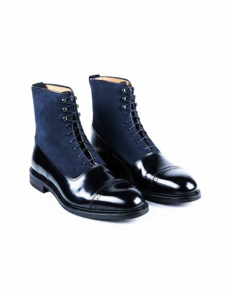 Ankle boots in black picusa antic leather with blue suede. Goodyear Stich, quality and handmade process.
