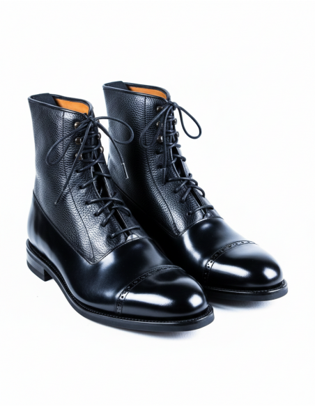 Botín en piel picusa color negro combinado con piel vegetal grabado color negro.