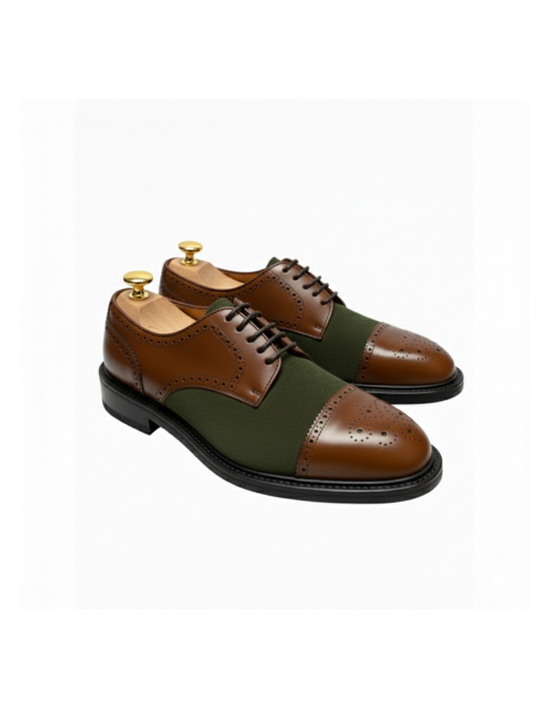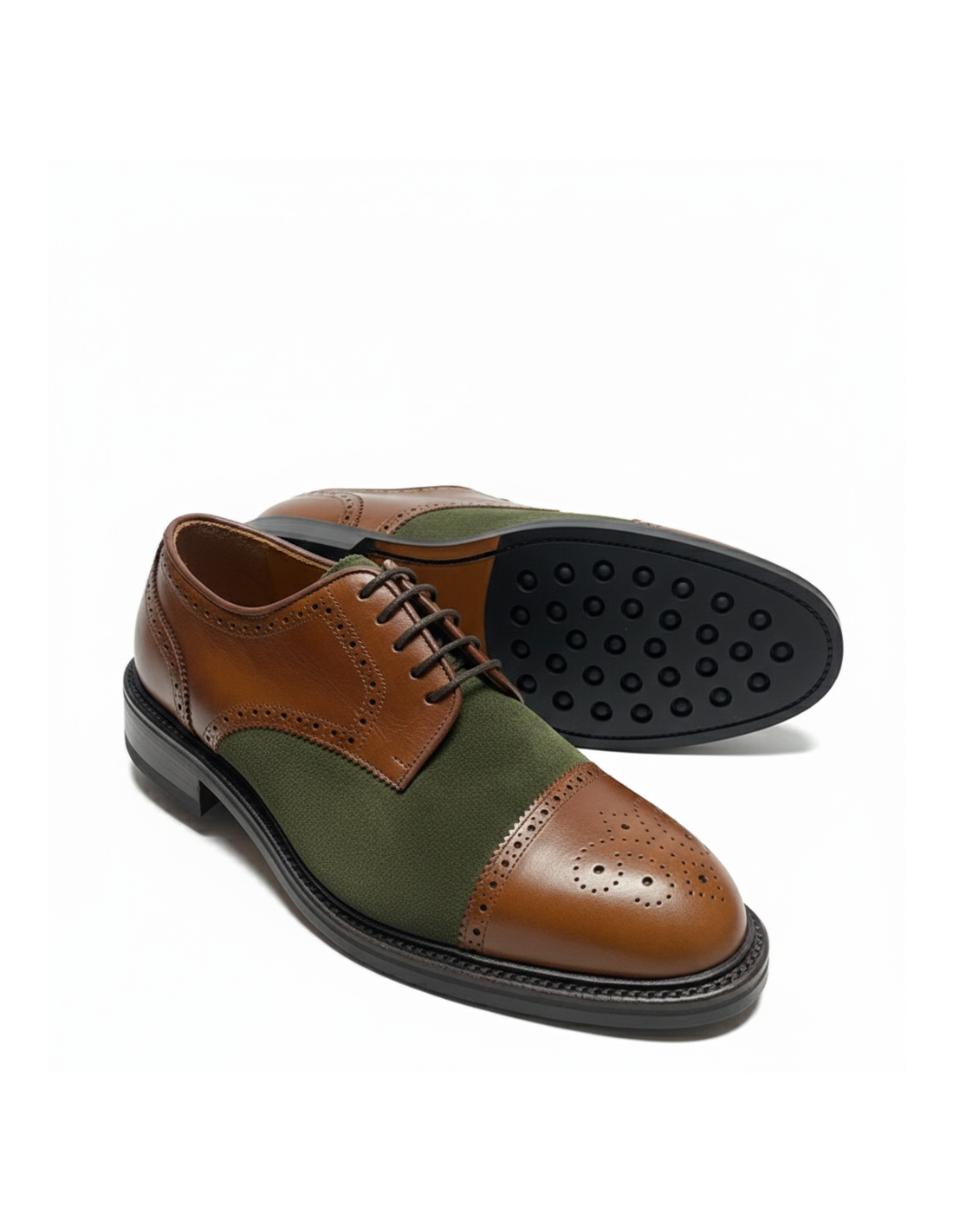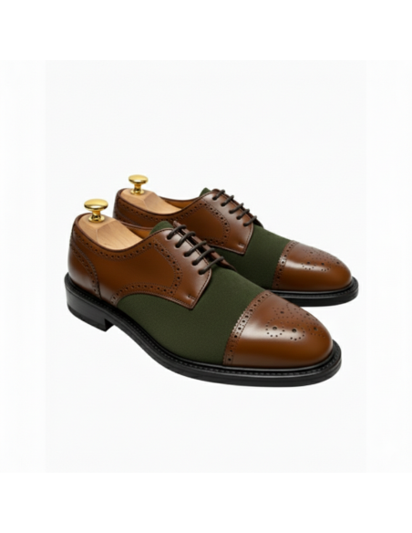 Zapatos en piel vegetal color cuero y afelpado color verde.